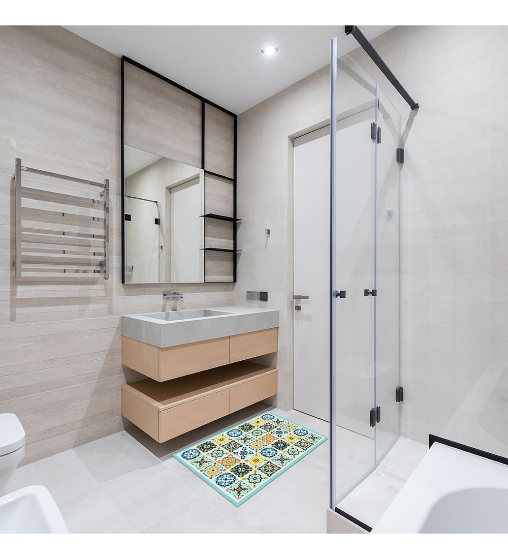 No requiere ningún tipo de instalación; se ubica sobre el piso sin necesidad de usar adhesivos ya que cuenta con una superficie trasera con características antideslizantes especialmente en pisos cerámicos, baldosas y porcelanatos; disminuyendo el riesgo de caídas.