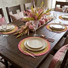 Este set es una celebración de la naturaleza en su estado más vibrante. Inspirado en los jardines mediterráneos, este diseño combina la calma del verde oliva con el enérgico florecer (bloom) de tonos fucsias. Su contorno orgánico y su patrón simétrico lo convierten en una pieza de arte para tu mesa.Tecnología Novo Tela & Cobre